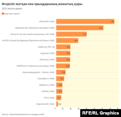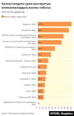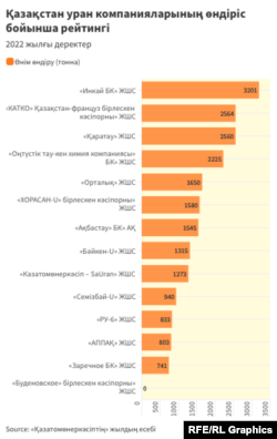 - Шетелдіктермен бірлескен 12 кәсіпорынның (БК) тең жартысының ортақ құрылтайшылары – "Росатомның" еншілестері. Ресей мемлекеттік корпорациясы Қазақстандағы 14 кен орнының бесеуінен уран өндіреді.