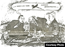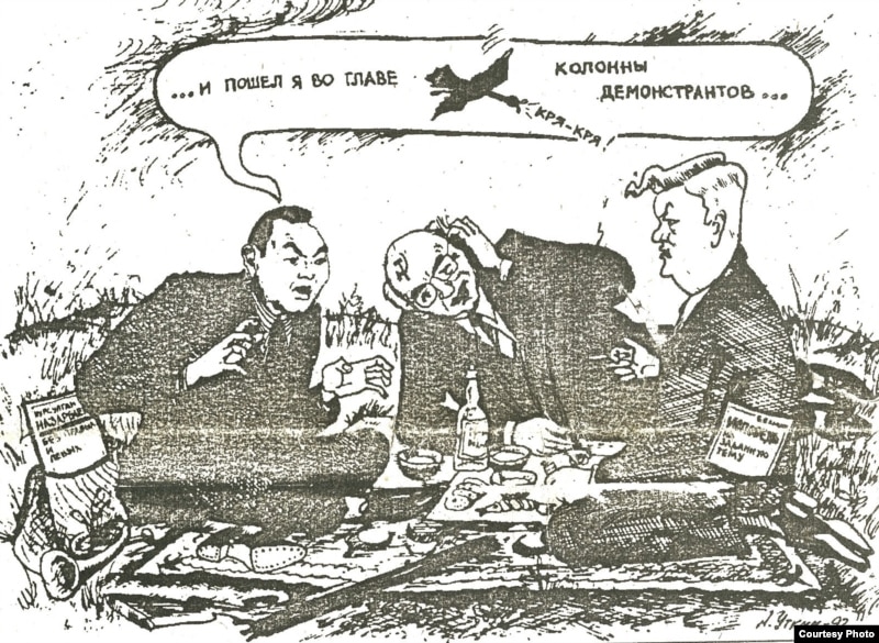 Нұрсұлтан Назарбаевтың Алматыда 1986 жылы желтоқсанда шеруге шыққан жастарды бастап жүргені туралы айтқанын мысқылдайтын сатиралық сурет. Оның жанында Михаил Горбачев пен Борис Ельцин бейнеленген. «С-Демократ» тәуелсіз газетінде 1992 жылы шыққан сурет. Басылым шығарушысы және редакторы – Андрей Свиридов.