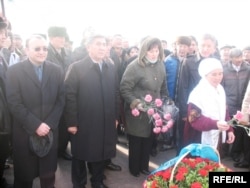 Жармахан Тұяқбай (сол жақтан екінші) және басқа оппозиция қайраткерлері Желтоқсан оқиғасына қатысушылардың құрметіне ілінген тақтайша алдына гүл шоқтарын қойды. Алматы, 17 желтоқсан 2008 жыл.