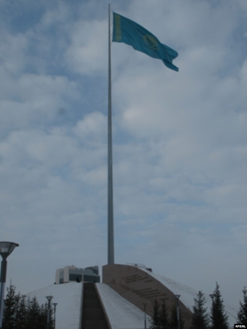 Бұрынғы саяси қуғын сүргін құрбандарын еске алу монументінің орнында тұрған Қазақстан туы. Астана, 15 желтоқсан 2009 жыл.