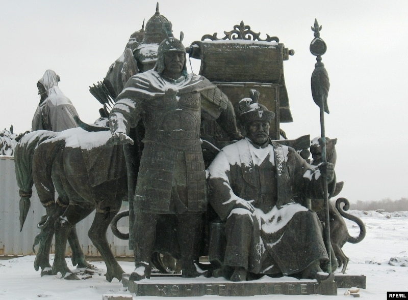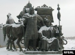 Астананың бір шетінде ашық далада қар басып тұрған қазақ хандары Жәнібек пен Керейдің ескерткіштері. 12 қараша 2009 жыл.
