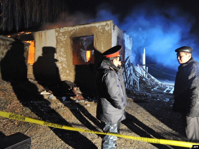 Осы үйге жасырынған «діни экстремистер» деген күдікке ілінгендер мен құқық қызметкерлері арасында болған атыс салдарынан бірнеше адам мерт болды. Арашан ауылы, Қырғызстан, 5 қаңтар 2011 жыл.
