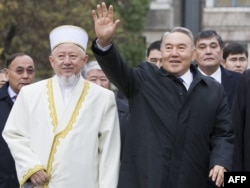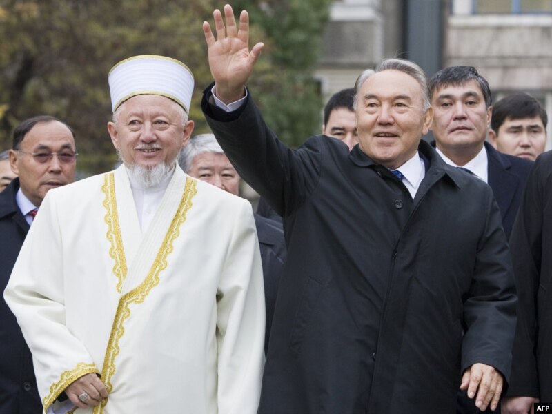 Қазақстан президенті Нұрсұлтан Назарбаев (оң жақта) пен ҚМДБ төрағасы, бас мүфти Әбсаттар Дербісәлі Алматыдағы Орталық мешіттен шығып келеді. Алматы, 16 қараша 2010 жыл. (Көрнекі сурет)