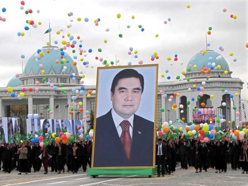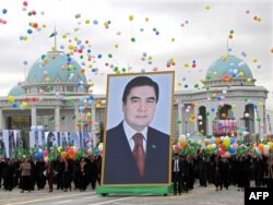 Түркіменстанның тәуелсіздігі күні ел президенті Гурбангулы Бердімұхаммедовтің суретін көтеріп шыққан халық. Ашғабат, 27 қазан 2009 жыл.