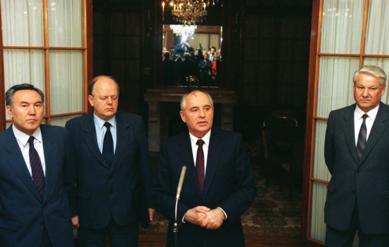 Қазақстан президенті Нұрсұлтан Назарбаев, Беларусь парламенті спикері Станислав Шушкевич, СССР президенті Михаил Горбачев, Ресей президенті Борис Ельцин. Мәскеу, 14 қараша 1991 жыл.